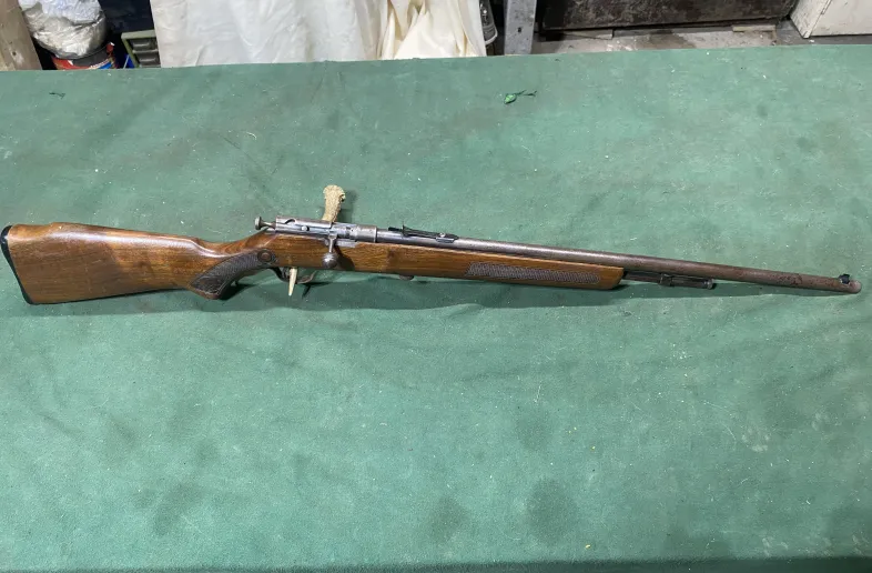 Cooey sure shot repeater 22 caliber with rabbit stock. Tube fed mag, bolt action. New sight elevator, shoots great. Nice piece of history thst you can enjoy.
