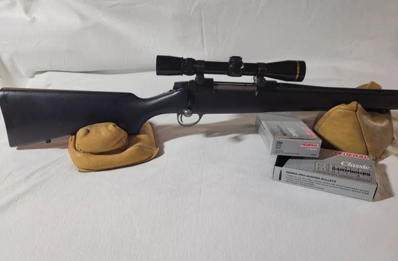 Sako AV 300 Winchester Magnum. Sako/McMillan black synthetic stock. Four round floor magazine. 22" barrel. Rings included. Scope not included. Ammo available as shown. Shipping available.