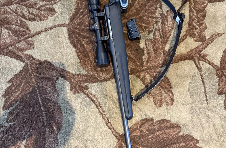 Left hand 7mm-08–never fired. Bolt action, scope, and sling