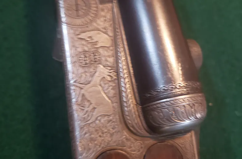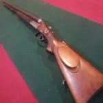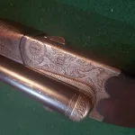 Hand crafted by Master Franz Sodia of Ferlach Austria drilling in 12 gauge sxs over 5.6x52R (22 Savage High-Power). A great combination. Beautifull engraved and Fully functional. There is pop up rear sight. Mounts for European scope mounts. Sadly the original scope was separated years ago. I do have a period correct German scope that is almost a perfect fit . A good gunsmith could make it worth. The scope can be discussed at an additional purchase. There is some light cracks which I have done my best to show. It's more like drying cracks then damage. The stock is very tight and stable. They could easily be filled with cyanoacrylic glue and the stock finish restored. I haven't done this as I tend to leave my firearms as original.