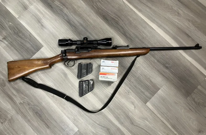 I have a well-maintained .303 British Enfield rifle. The wooden stocks are in great shape, and it comes with a Bushnell 3x9x40 scope. The shoulder strap, 2-clips and 2 1/2 boxes of ammo are also included. The bolt action is smooth, and it has a built-in storage compartment at the end of the Brass Butt. A classic!