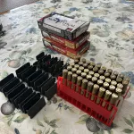 30.06 Springfield M1 Garand. 1960’s rebarrel (bore in excellent shape) serial number puts it a January, 1943 date of manufacture. Clip ejector works prefect loaded with 8 rounds. Comes with 15 En blocs (5 cut to hold 5 rounds) and 42 rounds of ammunition (22 reloads) in person meet up in tofield, cash only thanks.