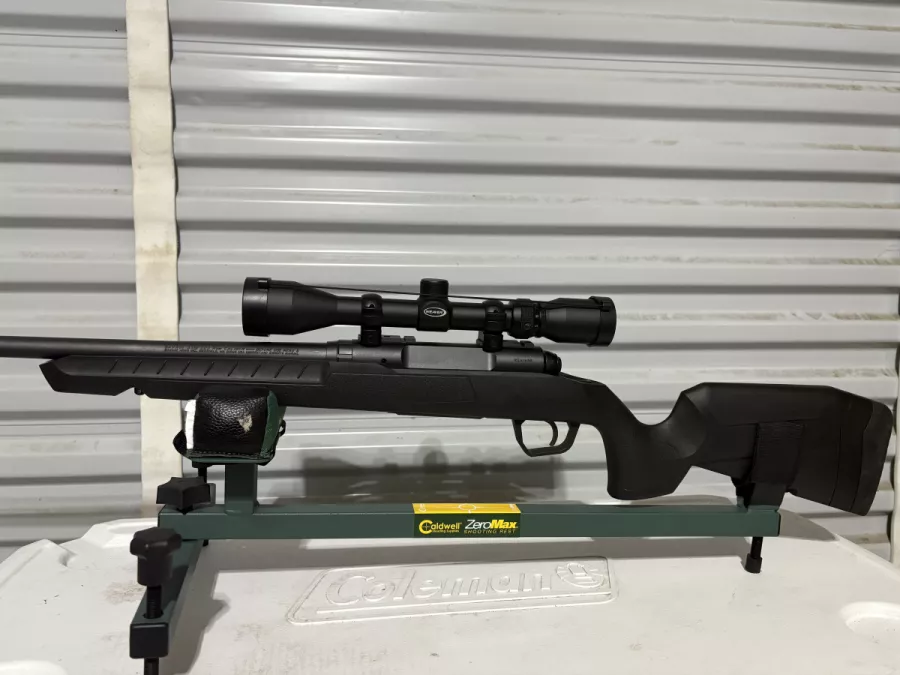New savage axis with piston grip stock, 30 shots taken, comes with 3-9x40 scope, 290 rounds of Remington target ammo, 40 rounds of Barnes VOR-TX and 21 rounds of federal varmint, bought gun for predator hunting but never went, would trade for another bolt gun in 243, 7mm08 6.5 creed/P.R.C or 308 1100 obo
