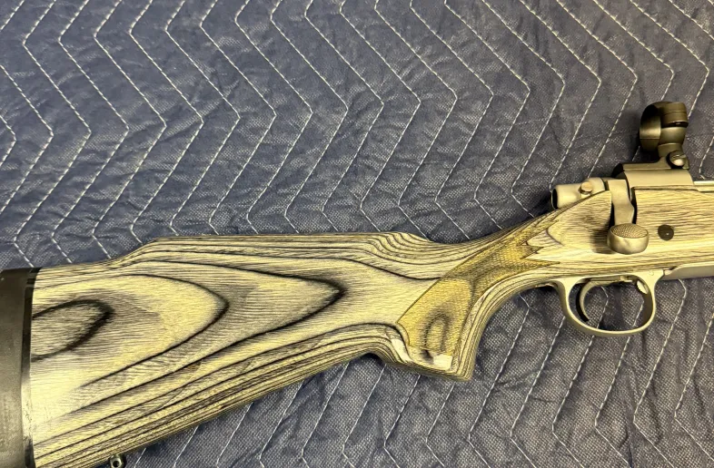 Stainless fluted barrel threaded muzzle break grey laminate stock. 30mm rings