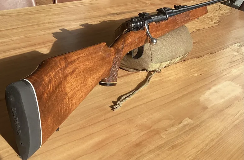 This rifle is in very good condition. Blueing, wood and bore are all good. Stock has been replaced with one with a raised cheek piece more suitable for using with a scope. Receiver is drilled and tapped for a scope and comes with steel Warn scope bases. Stock is glass bedded with skip line checkering and has a new recoil pad. Trigger is a Timney model with trigger blocking safety. Price reduced &100. Now $950.