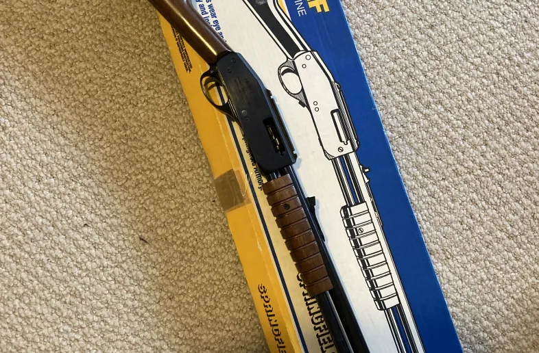 This is a pump action chambered in 44 Remington Magnum. It is rare. I would estimate maybe a dozen of these in 44 Mag exist in Canada. It has Williams front and rear sights installed. It comes with the original front and rear sights and the original box. This one is in good condition, it just has some bluing wear on the magazine tube and the barrel where the slide slides. Always cleaned thoroughly after use and protected with gun oil during storage. Never carried. Additional pictures on request. Located in the BC lower mainland.