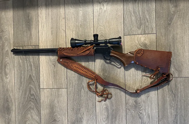 • Also comes with a genuine leather guard set (forearm and stock cover) from Gunstockcover.com, matching the style in reference photos