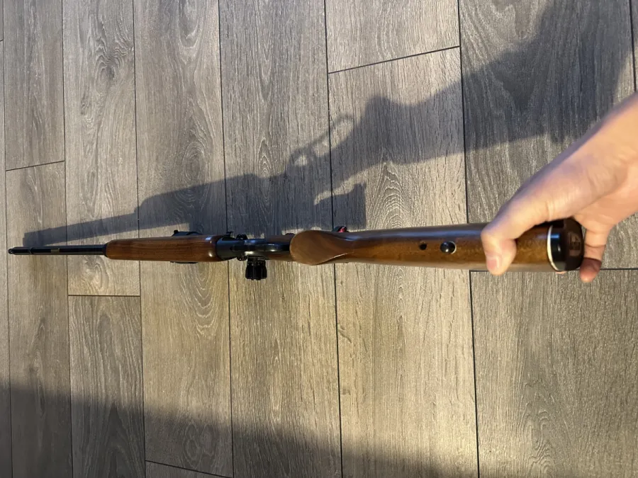 • Smooth two-piece walnut stock with semi-pistol grip and straight comb