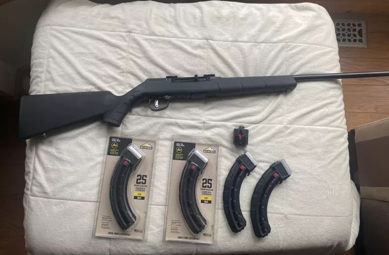 Selling a barely used Savage A22 in 22lr. Bought 4 -25 round mags for it and 1 extra 10 rd mag for it. Only a couple hundred rounds through it. PAL a must and shipping on buyer.