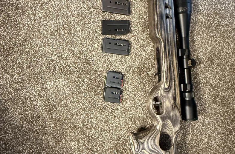 This is a custom savage 17 HMR. It has the heavy duty match style barrel on it. It is a bolt action. This rifle is in fantastic shape, and it has a custom stock in the Mako shark style. It also comes with six spare magazines, 2 five and 4 10 round magazines and a couple hundred rounds of ammunition. It also has a Bushnell legend 4-12 scope