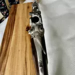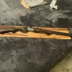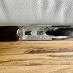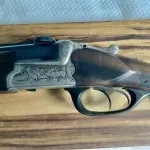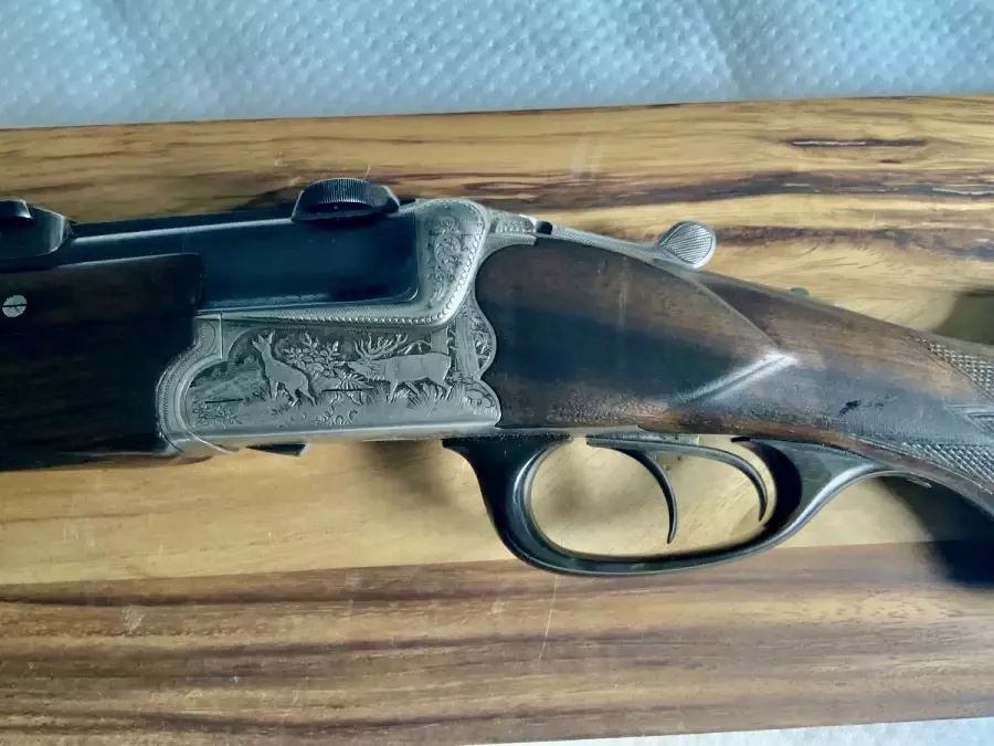 A beautiful German made combo rifle with a 16 ga (FC) bird barrel under a 7x57 med-big game barrel. Beautifully engraved silver receiver with hunting scenes of Elk and wild boar and scrolling throughout top and bottom. The Exquisitely grained and checkered German Black Walnut stocks are in excellent condition with a palm swell ,the 26” barrels are mirror clean and the extractors are mint.This has a heavy duty fold down rear sight and blade frt sight,the trigger guard is carved stag horn. The top of the receiver has custom German claw QD scope mounts that are beautifully engraved as well as the top rib which is exquisitely checkered. This also has heavy duty sling swivels,the lock up is Fort Knox tight.This is a beautifully example of German engineering & craftsmanship at it’s finest! This has had less than 40 rounds shot through it.