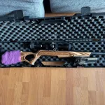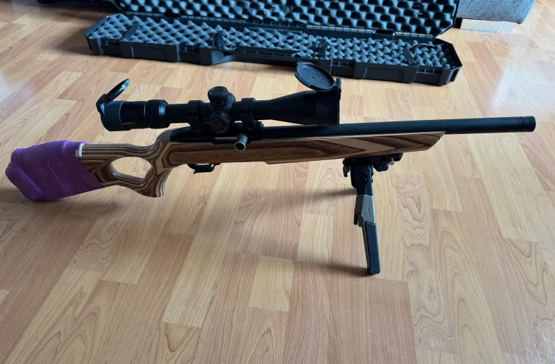 Ruger 10/22 with heavy barrel + laminated stock + bipod + Vortex + case