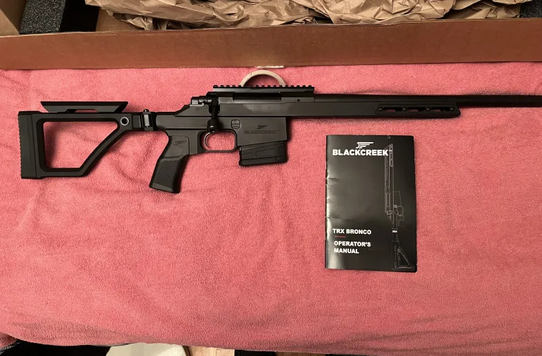 Black creek lab Bronco trx Hunter ( 308 ) " New in the box " 16 in. Threaded barrel. Extremely smooth action. Very crisp Trigger. Foldable stock for back packing. Cleaned and oiled ready for the range or hunt.
