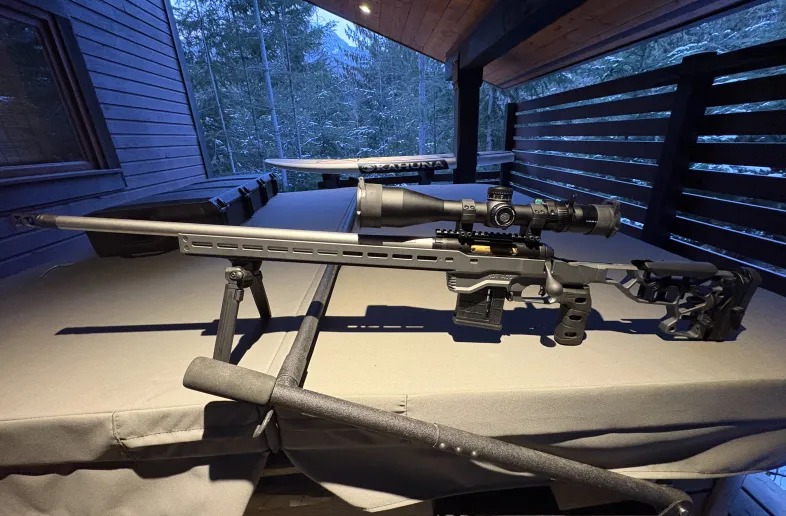 Vortex Venom 5 - 25 x 56 Rifle scope with MRAD reticle mounted on MDT high rings with Vortex scope cap covers, throw lever and gun level already installed
