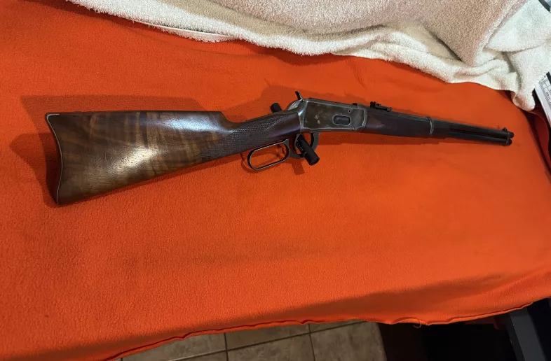 WINCHESTER 1894 - 38-55 SADDLE RING CARBINE RIFLE. SPECIAL ORDER FEATURES. STRAIGHT STOCK. 20" BARREL. FULL LENGTH TUBE MAG. DELUXE CHECKERED WOOD. REAR LADDER FLIP UP SIGHT. MADE IN 1911. NO TRADES. $3750 PLUS SHIPPING. PAYMENT - LAYAWAY PLAN AVAILABLE. CHECK OUT MY OTHER ADS.