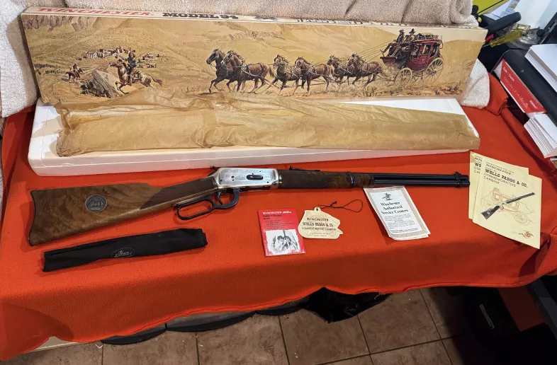 WINCHESTER MODEL 94 - WELLS FARGO & CO. COMMEMORATIVE CARBINE 30-30 LEVER ACTION RIFLE. 20" BARREL. SADDLE RING. NEW - UNFIRED IN BOX. COMES WITH PAPERS, WAX PAPER, STYROFOAM BOX AND LID, AND OUTER SLEEVE. 1852 - 1977 ( 125 YEARS). MADE IN 1977. 19,999 WERE MADE. OUTER SLEEVE AND STYROFOAM BOX ARE IN EXCELLENT CONDITION. NO TRADES. PAYMENT - LAYAWAY PLAN AVAILABLE. CHECK OUT MY OTHER ADS.