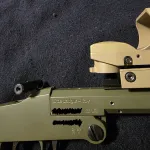 - Aftermarket red dot sight, pistol grip, and hammer extention