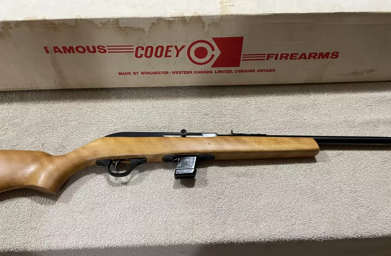 Up is another from my collection. This is the first model Cooey 64. It has the plastic mag. This gun is with a box and was sold to me years ago from a collector as unfired. I have not fired it. It has some minor scratching on the receiver shown in pics. This gun has no serial number. There is a number hand written on the end of the box but doesn't pertain to this gun. A hard to find gun in this condition with the factory plastic magazine.
