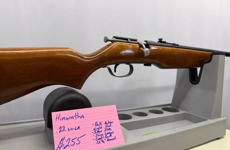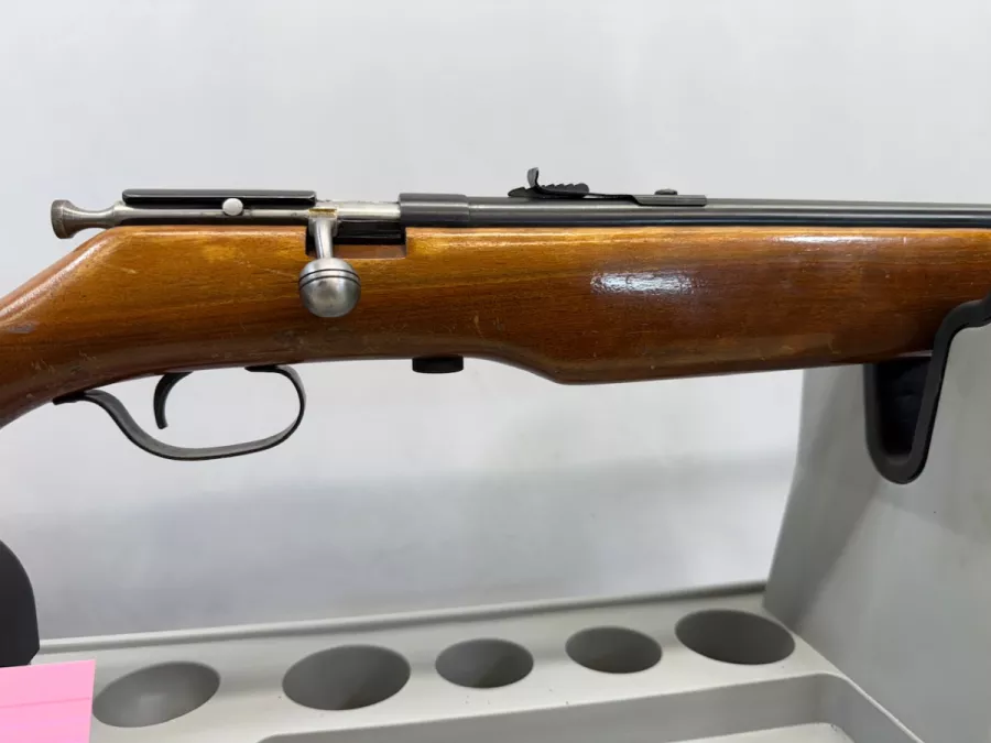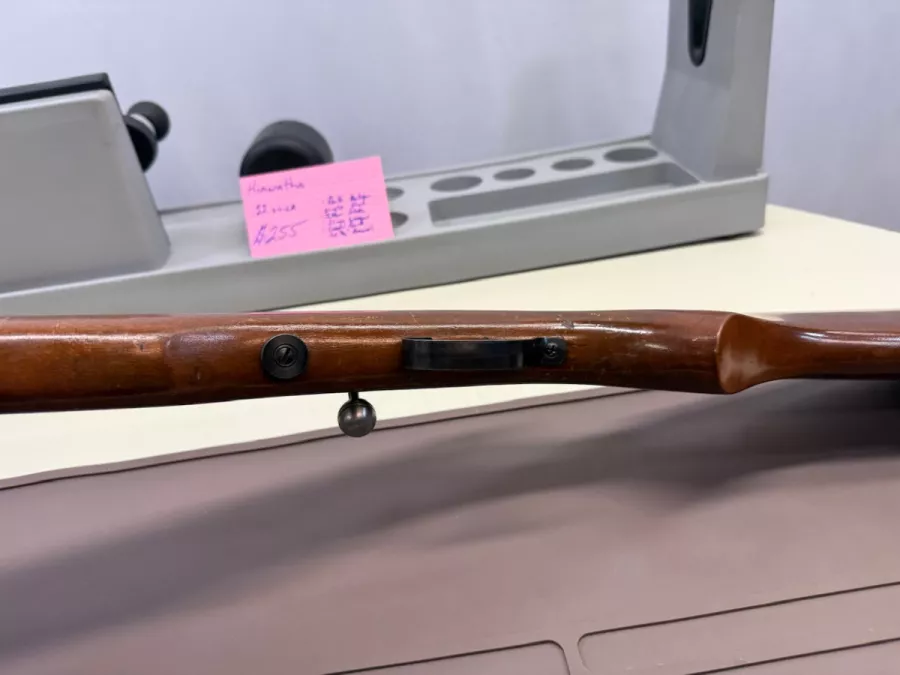 Hiawatha in .22 S-L-LR bolt action single shot in good condition. Has iron sites, sling loops, good bore, and a 26 3/4” Barrel. (Manufacturer by Cooey)