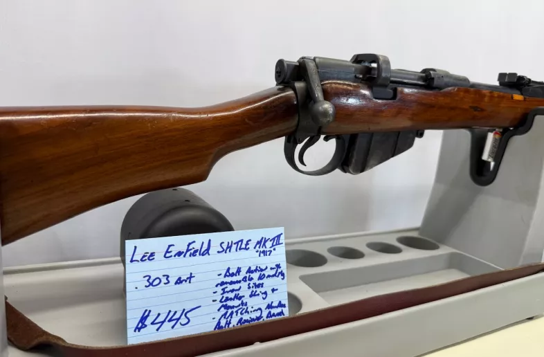 Lee Enfield SHTLE MK III “1917” in .303 British bolt action with removable metal 10 round magazine in Great condition. Has MATCHING NUMBERS bolt, receiver, and barrel, iron sites, leather sling and mounts, and a good bore. Shipping and insurance by purchaser valid PAL verification required.