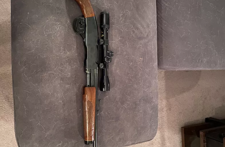 Remington pump action 308 with scope, 2 clips that hold 5 rounds each, scope and carrying case.