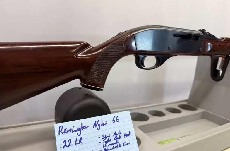 Remington Nylon 66 in .22 LR semi automatic with 15 round butt stock tube feed in Very Good Condition with normal handling wear marks. Has adjustable iron sites, receiver is grooved for scope mounts, is light weight, and was manufactured in Canada.