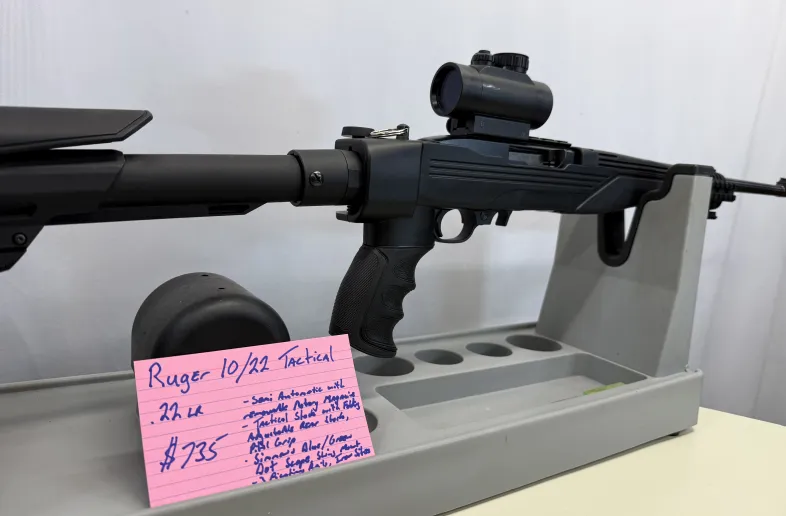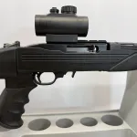 Ruger 10/22 Tactical in .22 LR semi automatic with removable rotary magazine in Excellent condition. Has a ATI pistol grip stock with adjustable rear stock that folds with cheek rest, 3 Picatinny rails, sling mount, Simmons Blue/Green Dot optic, and iron sites. Shipping and insurance by purchaser valid PAL verification required.
