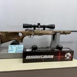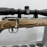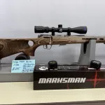 Savage 93R17 Stainless Heavy Barrel With thumb hole Deluxe laminate stock in .17 HMR bolt action with removable stainless steel magazine in Excellent condition. Comes with a new Scorpion Marksman 3-9x40 with Lens caps, Accutrigger adjustable trigger system, owners manual, trigger adjustment tool, and 3 sling/bipod mounts. Shipping and insurance by purchaser valid PAL verification required.