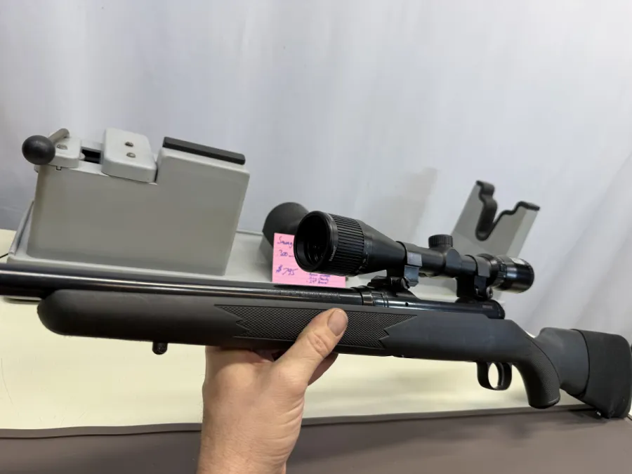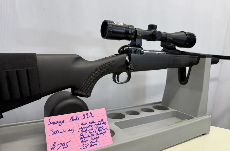 Savage Model 111 in .300 win mag bolt action with removable metal magazine in Great Plus condition. Comes with a Bushnell Trophy XLT 4-12X40 with adjustable yardage, rear stock ammunition sleeve, sling mounts, and a 24” barrel. Shipping and insurance by purchaser, valid PAL verification required.