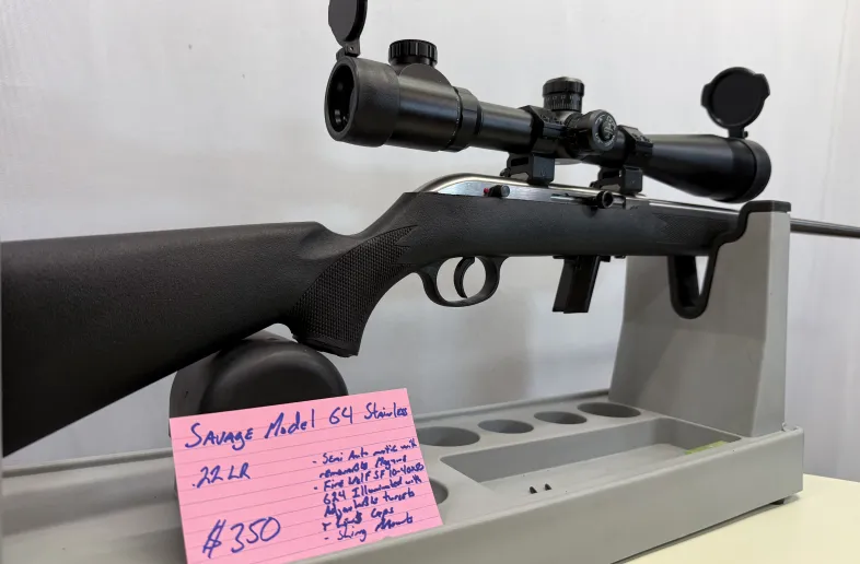 Savage Model 64 Stainless in .22 LR semi automatic with removable metal magazine in Excellent condition. Comes with a Fire Wolf-FW7-CH SF 10-49E G24 Illuminated Scope with adjustable turrets and flip up lens covers, and sling mounts. Shipping and insurance by purchaser, valid PAL verification required.