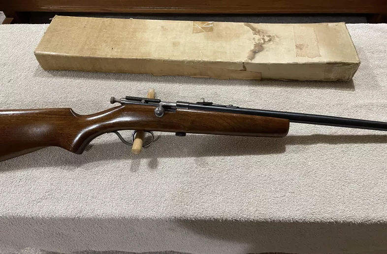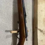Up is my Cooey model 39. This is the original Cooey 39, not Winchester. It comes with the box. It is in original condition. If I remember correctly it was a display model in a now long defunct gun shop. There is the odd very minor mark and the bluing at the rear of the breech is speckled. The pic really magnifies the look. Apparently one recently sold at auction with box for $1400.00!!