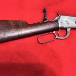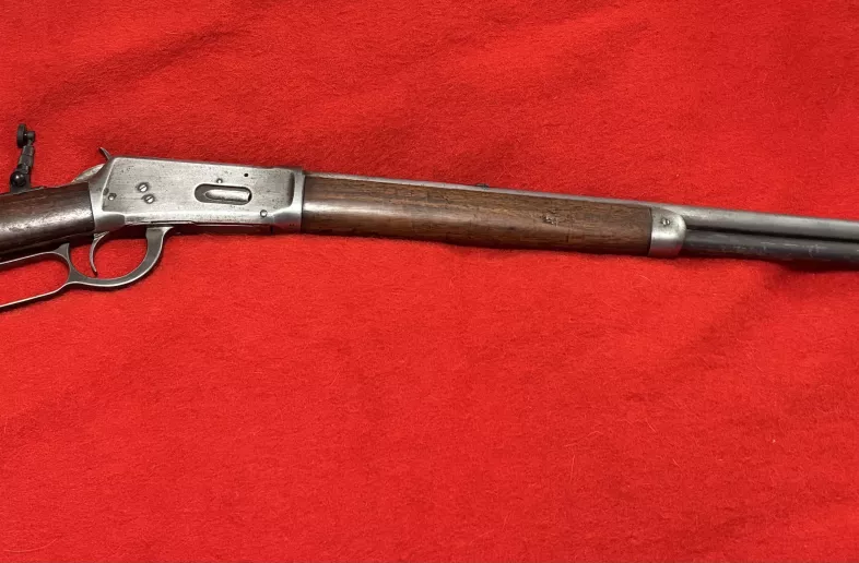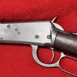 Very nice model 94 in 32-40 which is a rare caliber for the 94 , early manufacturing date of 1906 , blueing mostly gone and lightly buffed surface patina , screws are in excellent condition, has original front sight and newer correct Lyman tang sight , wood has never been sanded and in nice shape , I can dig up some brass to throw in , bore is 6/10 has wear but still has decent rifling , an honest shooter for its vintage.