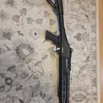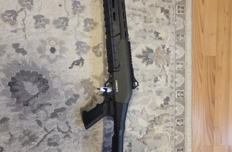 Canuck Commander 12 gauge shotgun. 14 inch barrel, 2 3/4 or 3 inch shells. Dark green receiver. Adjustable rear sight, fiber optic front sight.
