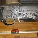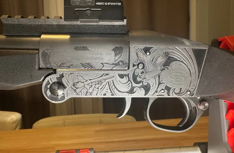 Charles Daly / Chiappa single shot 12 gauge, custom engraved by Frosty Pine Labs.