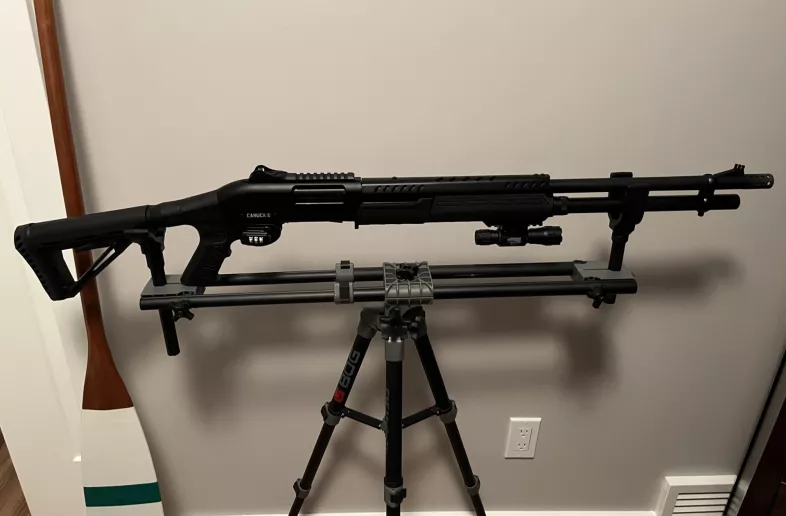 The Canuck sentry pump action shotgun features a 24" barrel, 9 shot capacity, fibre optic front sight, picatinny rail and a pistol collapsible stock. The sentry is compatible with mobil chokes and comes with breacher choke and Flashlight.