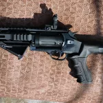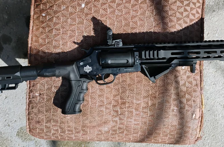 Tactical 410 gauge revolver shotgun. Features a compact 14" barrel for maneuverability and precision. Fixed cylinder choke, flip-up sights. Designed for tactical use, offers reliability and power in a sleek, robust package. The Rev410 revolver offers another great option for 410 shooters which will be sure to impress your friends. All come equipped with two removable cylinder plugs to limit capability to three shots for hunting. It's brand new and needs breaking in, might be picky on ammo (the cheap stuff did shoot but the premium extracted better). I shot a total of 10 shots through it and I just like my single shooter and lever action ones better. The 14" version is more accurate than the 9" counterpart revolver shotgun IMO. No trades, PAL required, can be shipped Canada-wide, can be delivered local and area.