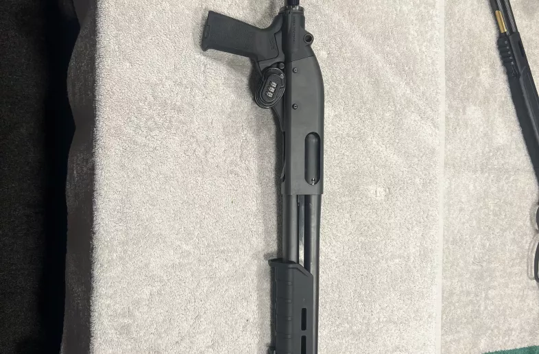 This is pretty much as built as an 870 can get. It is a 2-3/4" and 3" magnum receiver and 20" smoothbore barrel. It has the Mesa Tactical LEO pistol grip adaptor and the Kynshot hydraulic recoil absorbing buffer tube. The buttstock, pistol grip and forend are all Magpul, the 2 shot extension is GG&G, the extractor is a Volquestern Arms, the firing pin spring is a PTG. The receiver is drilled and tappd for a rail, it also has a GG&G oversized safety. The action has been deburred and slicked up by a gunsmith. It also has a Mesa Tactical 6 shot quiver. If you were to build this shotgun, and have the custom gunsmithing work done it would cost over $2000. The KynShot hydraulic recoil absorber removes about 70% of the felt recoil, the kick with a 2-3/4" slug feels like nothing at all.