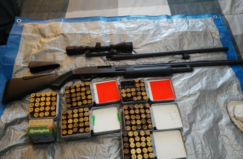 Mossberg 500 20g. Vent rib and cantilever rifled barrels. 3 chokes. Bushnell Banner 2 3-9x50. About 150nrounds of various 20g ammo including some paper shells.