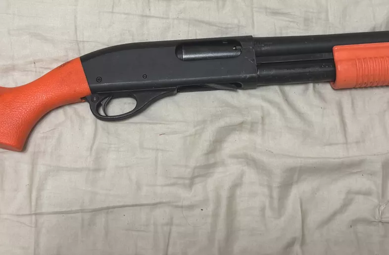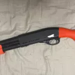 The (very rare in Canada) orange SpeedFeed stock set holds 4 extra shells and designates this gun as a “Less Lethal” shotgun. It can still fire regular ammunition, but it’s orange so a police officer can tell the difference at a glance between a weapon loaded with lethal ammo (00 buck or slug) and one loaded with less lethal ammo such as beanbags, rubber buck, or rubber slugs.