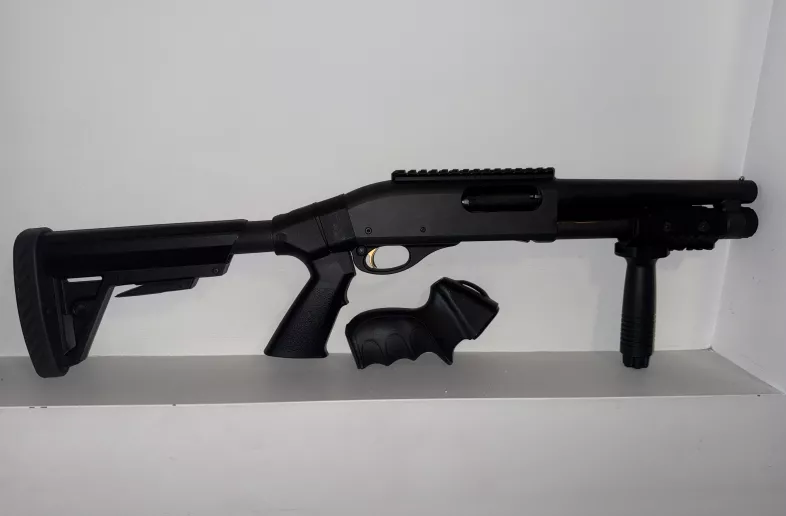 Comes with pre-installed ATI Shotforce tactical stock, Promag fore-grip and a TacStar pistol grip as seen in the photos.