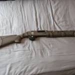 Camo, pump action 12 gauge shotgun