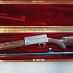 Produced in Japan in 1984, with the engraving done in Belgium by Fabrique Nationale. Single nickel bead sight, 12 gauge with a 2 3/4" chamber. 28 inch vent rib barrel. Satin gray receiver, with photo-etched and engraved scrollwork, game scenes and John Browning. Fancy walnut round knob pistol grip stock, with dot-bordered checkering on the forearm and wrist, 14" pull and FN/ Browning buttplate.