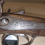 This is a J. Manton London Damascus Twist Black Powder Shotgun. While it's being sold as a functional firearm, its too old and not safe to shoot. This gun should be hung on a wall of a hunting cabin. It's got a great engraving of a bird dog on the locks and stocks.