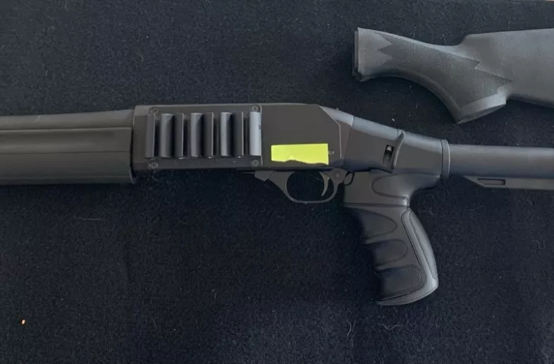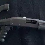 12 gauge pump-action shotgun with factory 14" barrel (accepts 2¾" & 3" shells). Fitted with an aftermarket adjustable tactical stock with pistol-grip(original factory stock included). Forearm modified to accept the included side-saddle 6-round shell holder. Red fiber-optic front sight installed in place of the factory bead for faster target acquisition. First owner. Excellent mechanical condition.