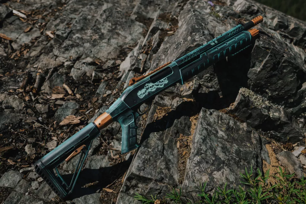 This now looks as hard as it kicks. Selling a full custom blue battleworn with laser etched skulls + details, paired with copper accents making it a real head turner. One of a kind by far for your collection. Smooth action. Less than 50 shells shot.
