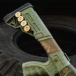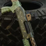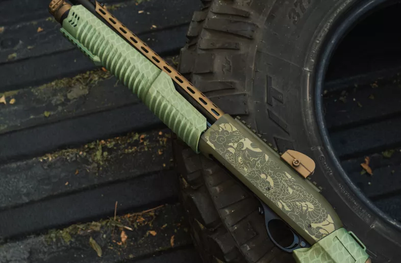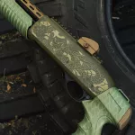 Brand new Huglu Victor P-TAC Pump Action 12gauge tactical shotgun. Comes with pistol grip end + stock with shell holder. 14.5" A one of a kind Japanese inspired custom cerakote design from front to back. Oni vs Serpent on OD green for the chassis, scales on the crocodile green (with gold metallics) on the furniture, topped off with burnt bronze accents. RebelTech brings you the highest level of both quality + creativity. You've never seen one like it, and your collection definitely wants it!