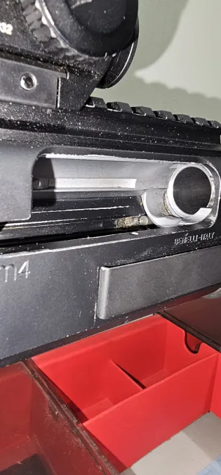 Comes with the red dot sight, extended charging handle, bolt release tang and shell holder