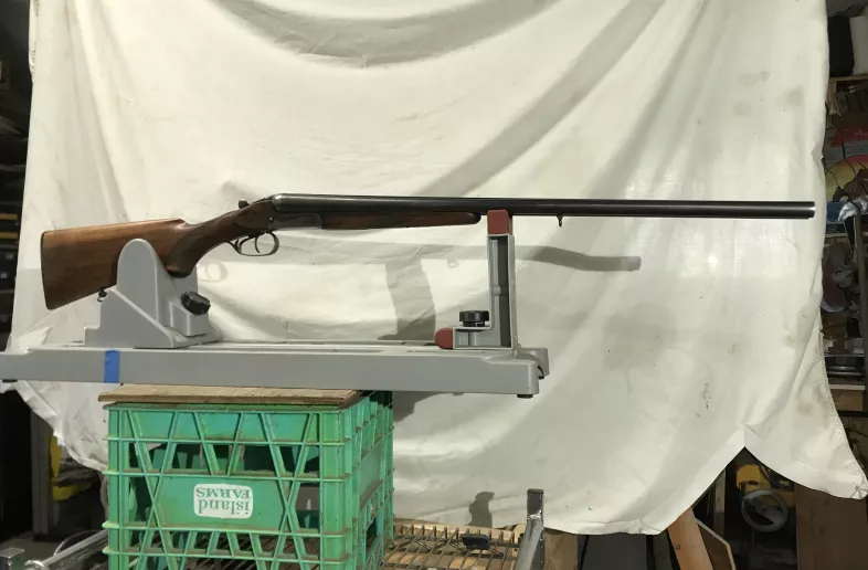 nice old german sxs 12g fine checkering on walnut.double trigger .overall very good condition. missing brass bead front .