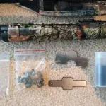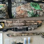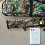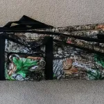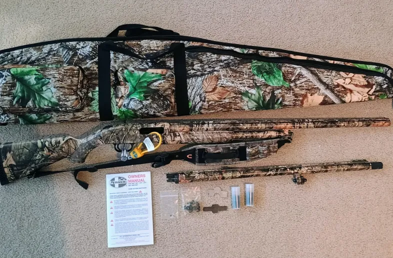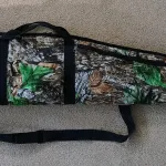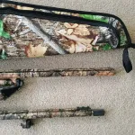 - Camo shotgun carry case with handles, shoulder strap, and three pockets, including an extended front pocket that fits the 24" barrel (whole package fits in this case
