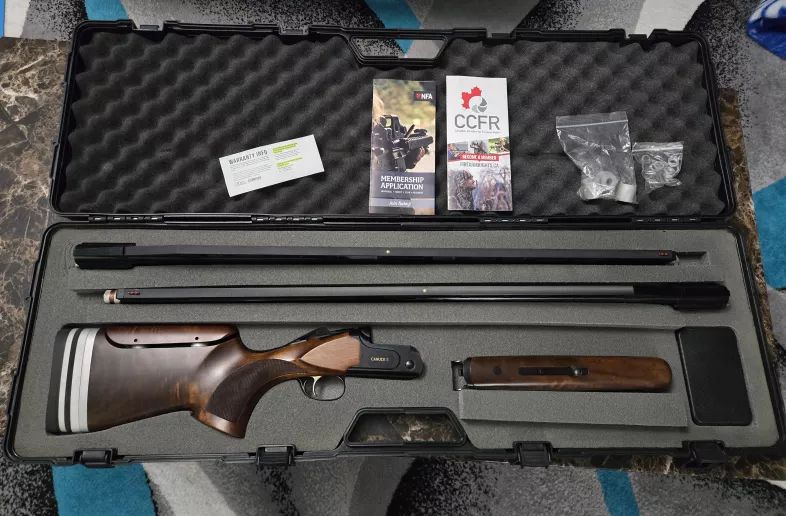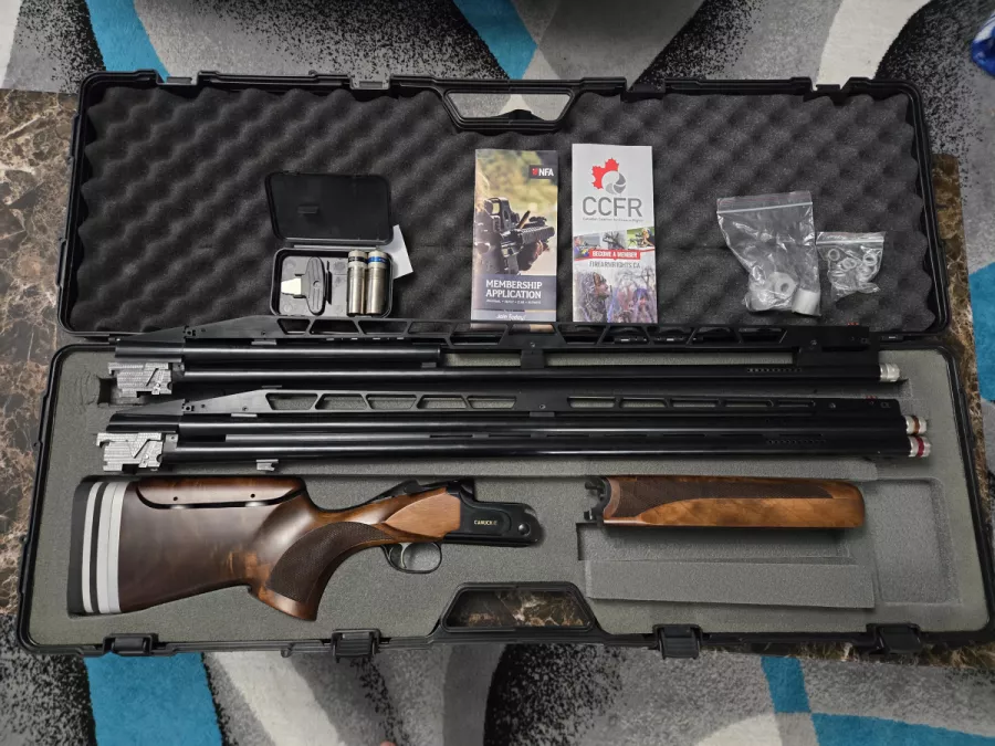 This Canuck Trap Over/Under Shotgun sports a 32" double barrel chambered for 2-3/4" Shells as well as a 32" Single barrel. The Shotgun has a turkish walnut stock with buffer pad. Also featuring 5 Mobil choke tubes.